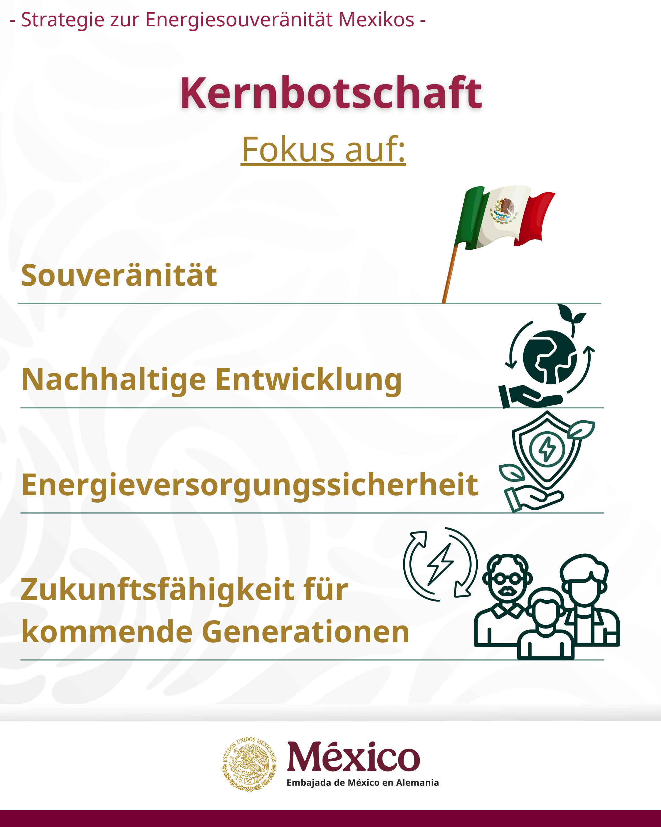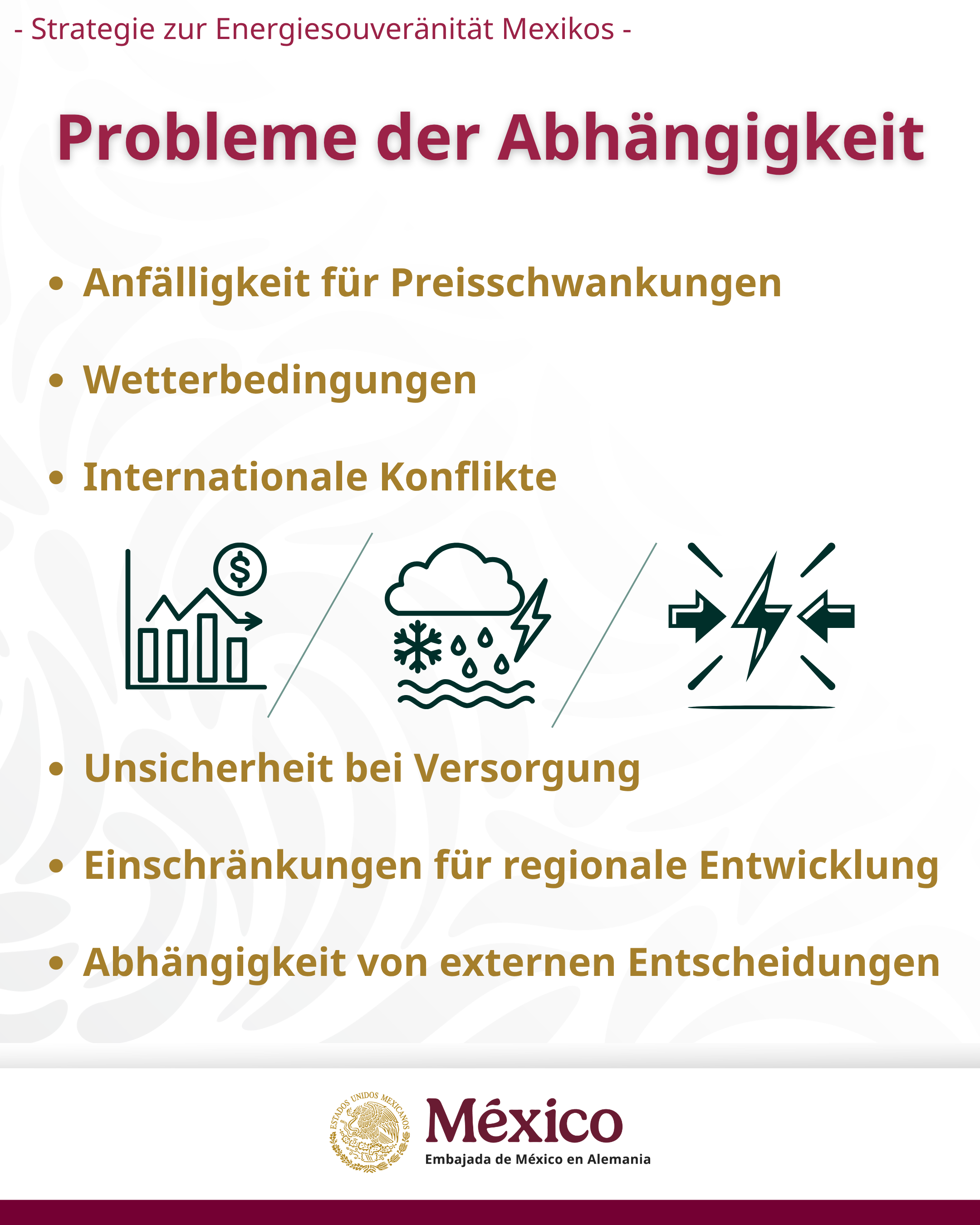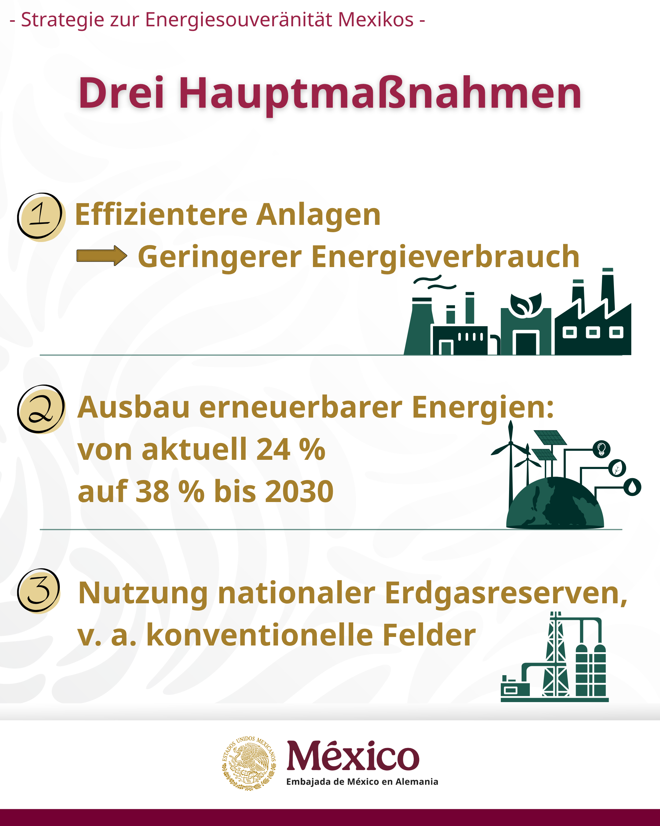 Präsidentin Sheinbaum wies darauf hin, dass diese Abhängigkeit zu einer erhöhten Anfälligkeit gegenüber internationalen Preisschwankungen, Wetterbedingungen, internationalen Konflikten, Einschränkungen der regionalen Entwicklung, Unsicherheiten in der Versorgung sowie Abhängigkeit von externen Entscheidungen führt. Daher besteht das Ziel darin, Mexikos Erdgasreserven zu nutzen und gleichzeitig den Anteil erneuerbarer Energien an der Stromerzeugung bis 2030 von derzeit 24 % auf 38 % zu erhöhen.