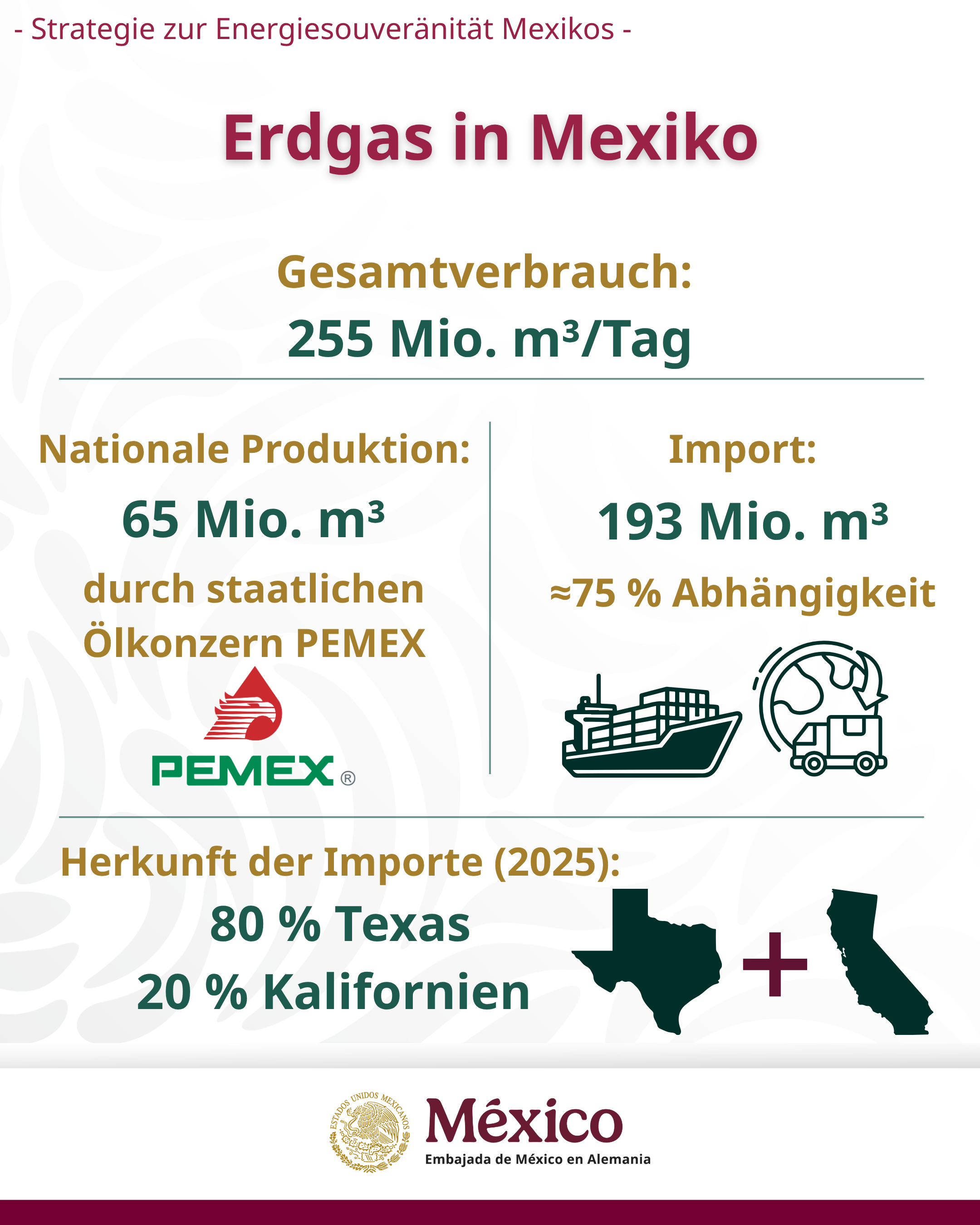 Energieministerin Luz Elena González Escobar erklärte, dass Mexiko täglich 255 Mio. m³ Erdgas verbraucht, wovon 65 Mio. durch Petróleos Mexicanos (Pemex) produziert und 193 Mio. importiert werden. Dies bedeutet, dass derzeit rund 75 % des verbrauchten Erdgases importiert werden; im Jahr 2025 stammten etwa 80 % davon aus Texas und 20 % aus Kalifornien.