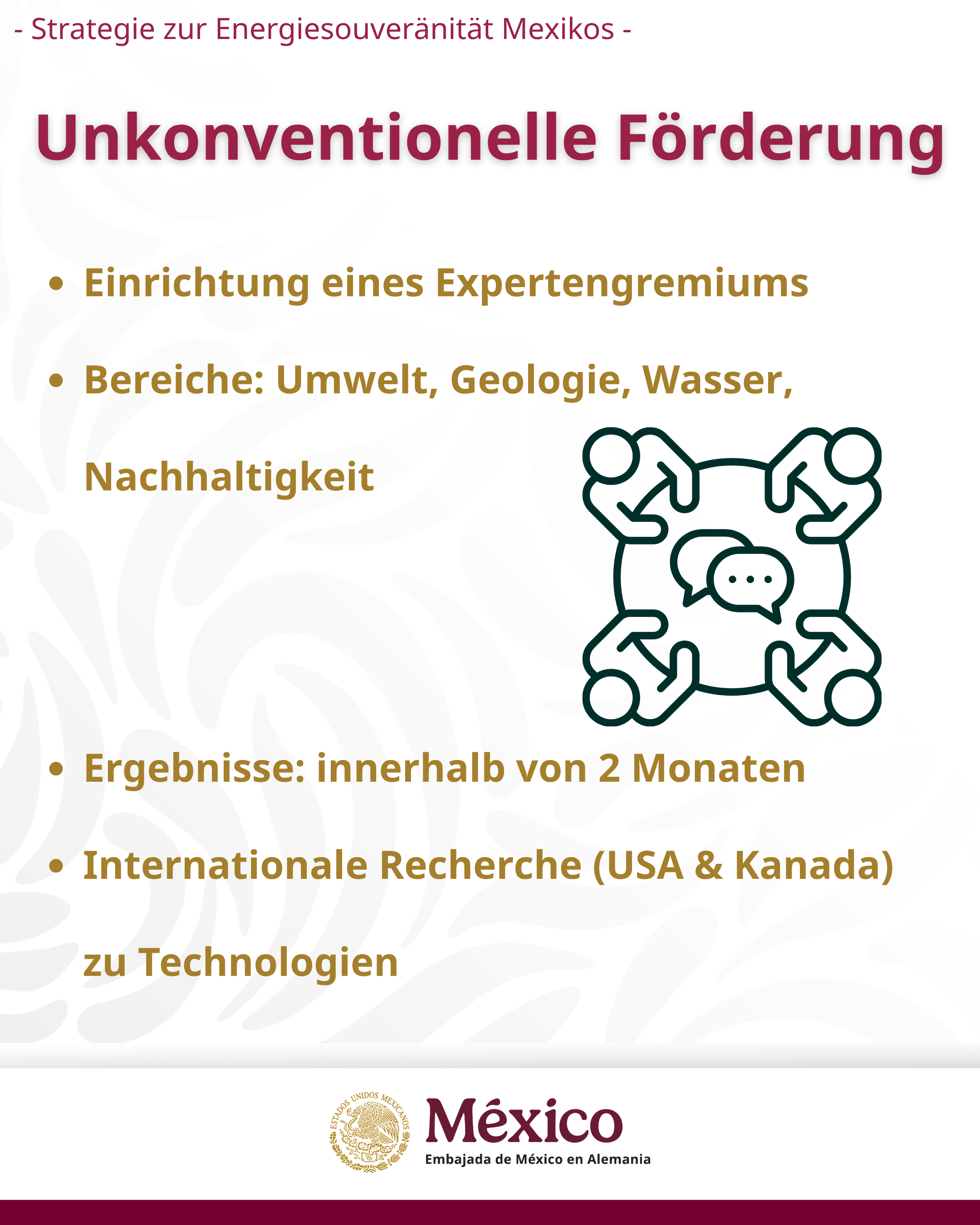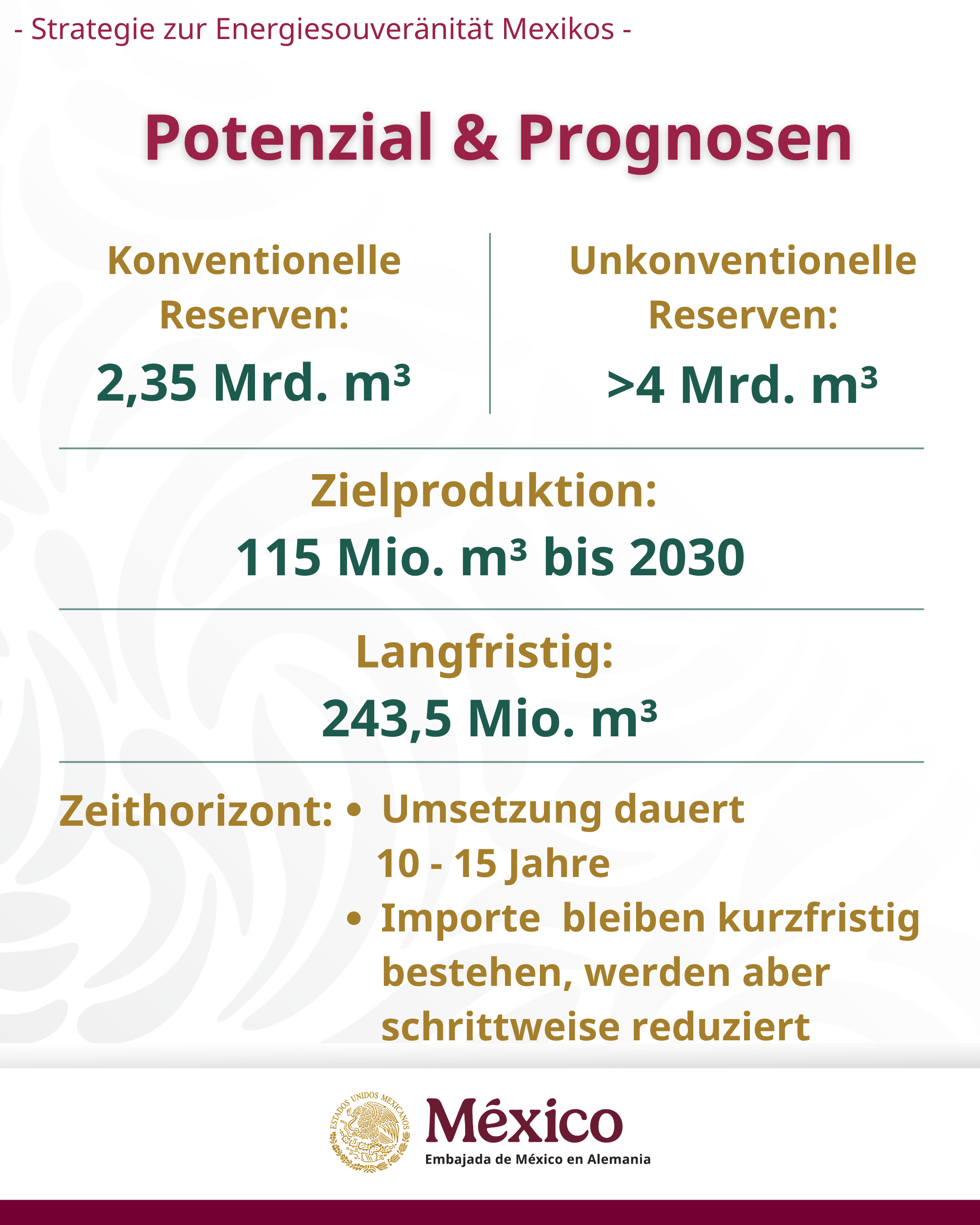 Rodríguez erklärte, dass ein erhebliches Förderpotenzial besteht: rund 2,35 Mrd. Kubikmeter in konventionellen Feldern und über 4 Mrd. Kubikmeter in unkonventionellen Feldern. Zudem werde Pemex gemäß der sektoralen Planung bis 2030 etwa 115 Mio. Kubikmeter Erdgas produzieren, mit der Möglichkeit, diese Menge in den kommenden zehn Jahren – auch durch unkonventionelle Förderung – auf bis zu 243,5 Mio. Kubikmeter zu steigern.