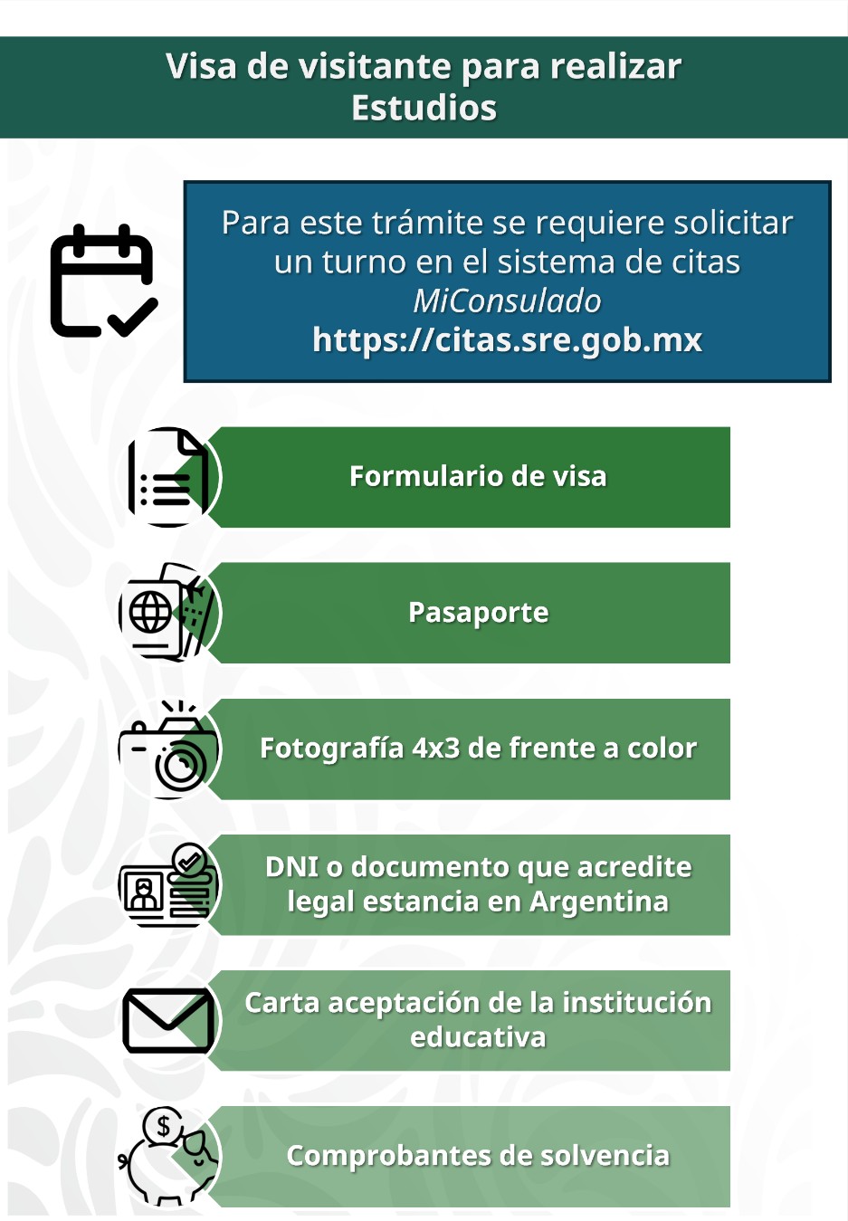 La visa de visitante bajo el supuesto de estudios se emite a favor de las personas que desean viajar a México para realizar estudios en una institución educativa mexicana, perteneciente al Sistema Educativo Nacional, por un período menor a 180 días, sin recibir honorarios o remuneración alguna.