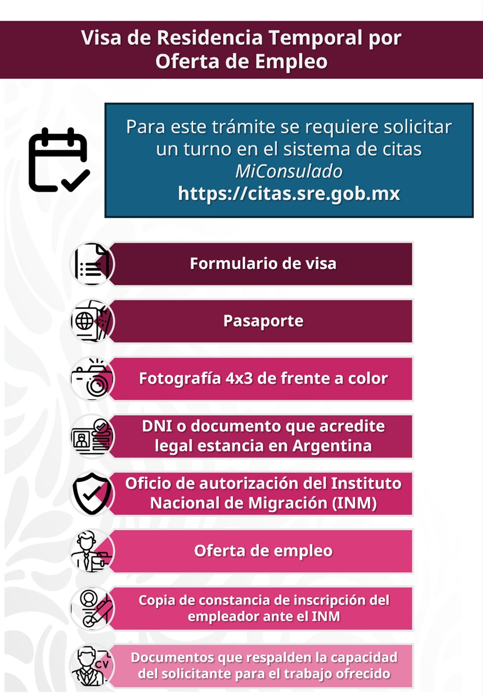 Para obtener esta visa, los solicitantes deben contar con una oferta de empleo y el empleador debe solicitar previamente desde México la autorización del Instituto Nacional de Migración (INM) para la emisión de la visa.