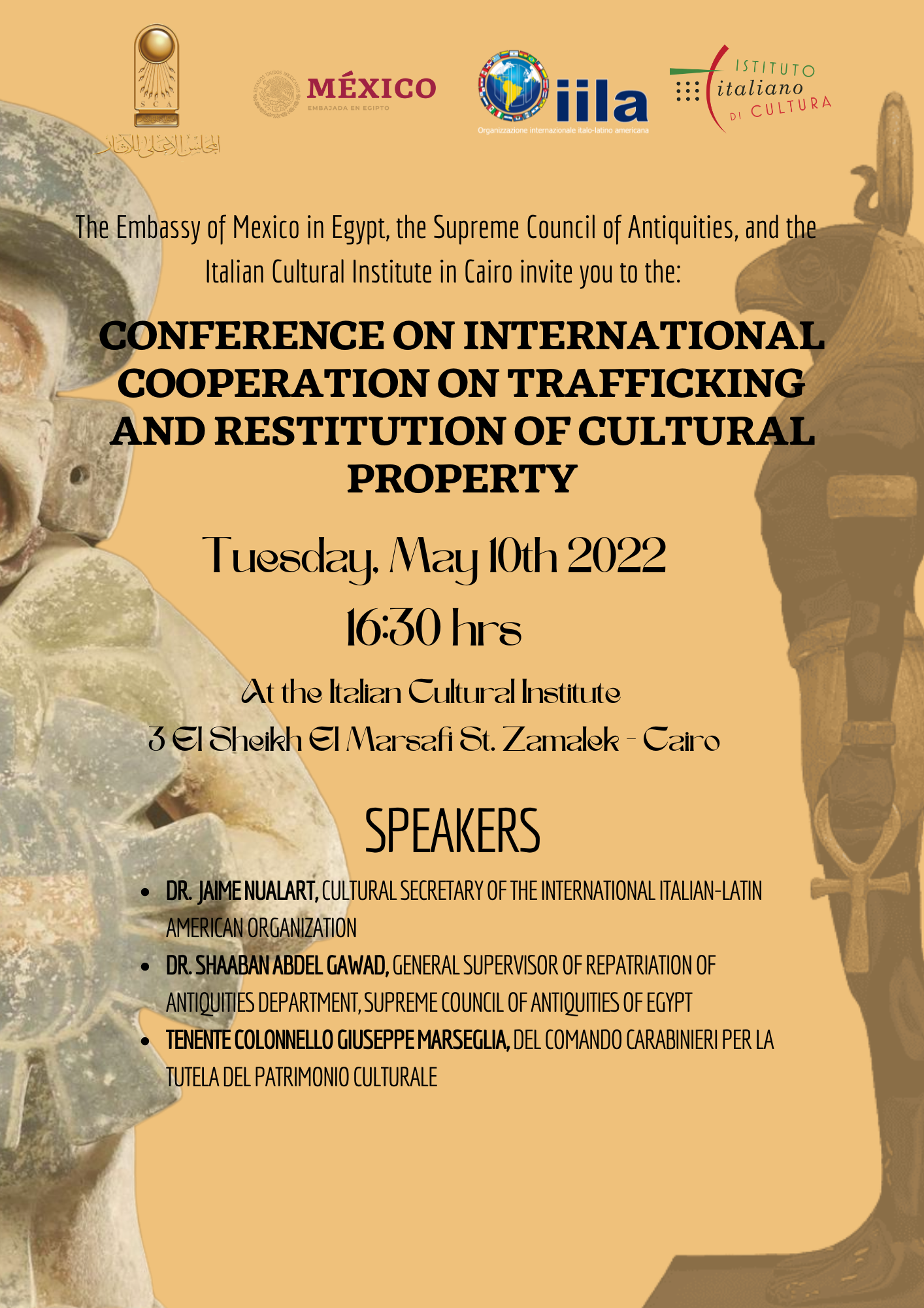 Los asistentes al evento tuvieron la oportunidad de escuchar al gestor cultural mexicano y Secretario Cultural de la Organización International Italo-Latinoamericana (IILA), Dr. Jaime Nualart, al teniente coronel Giuseppe Marseglia del Comando de Carabineros para la Tutela del Patrimonio Cultural de Italia (TPC), y al Supervisor General del Departamento de Repatriación del Consejo Supremo de Antigüedades de Egipto, Dr. Shaaban Abdel Gawad. Asimismo, participaron los Embajadores de México, Octavio Tripp, y de Italia, Michele Quaroni.