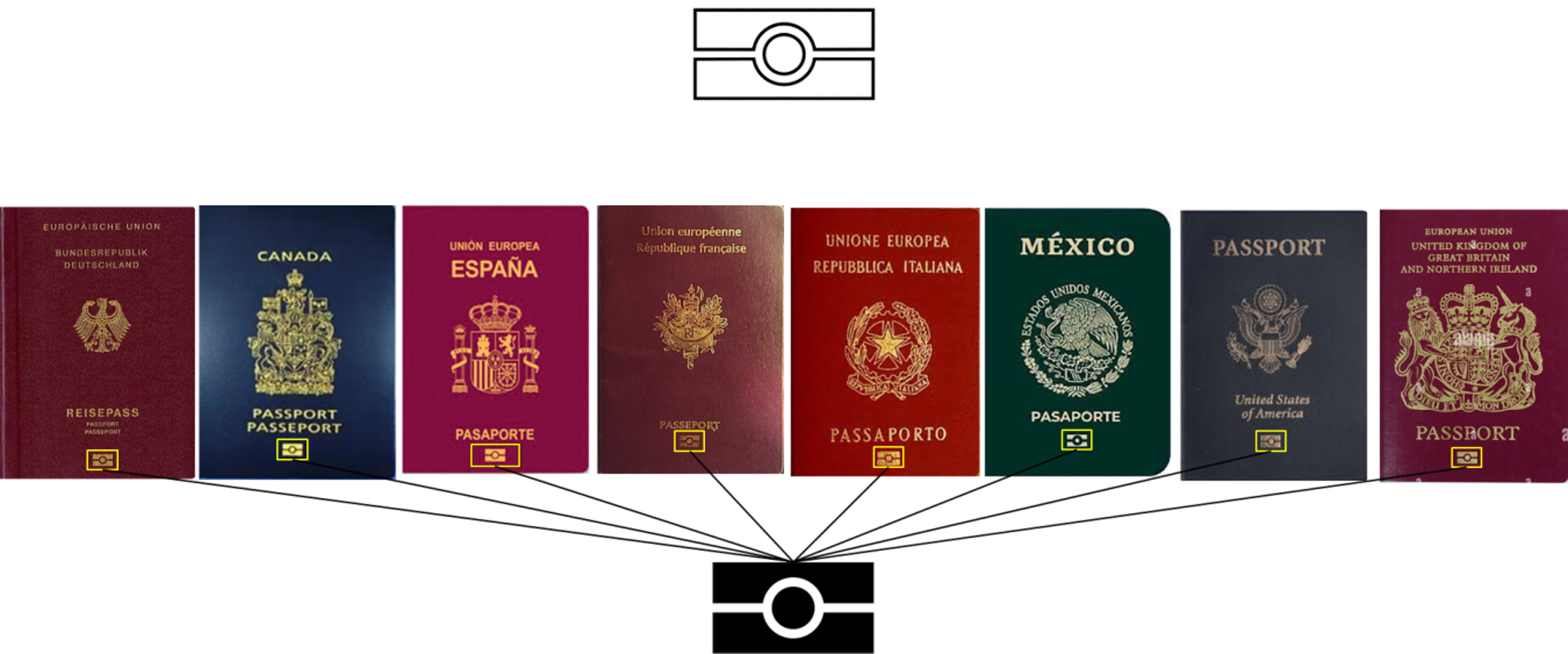 Todos los pasaportes electrónicos tienen en la parte inferior media de la portada un símbolo que lo identifica como un pasaporte electrónico: