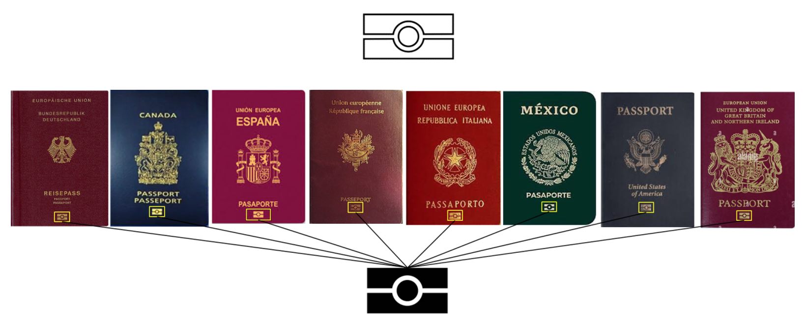 Todos los pasaportes electrónicos tienen en la parte inferior media de la portada un símbolo que lo identifica como un pasaporte electrónico: