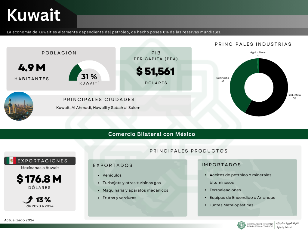 Con una población estimada de 4.9 millones de habitantes, de los cuales 31% son kuwaitíes, Kuwait registra uno de los niveles de ingreso per cápita más altos de la región, alcanzando los 51,561 dólares (PPA). Estas condiciones lo convierten en un destino atractivo para la inversión y la expansión de productos mexicanos.
