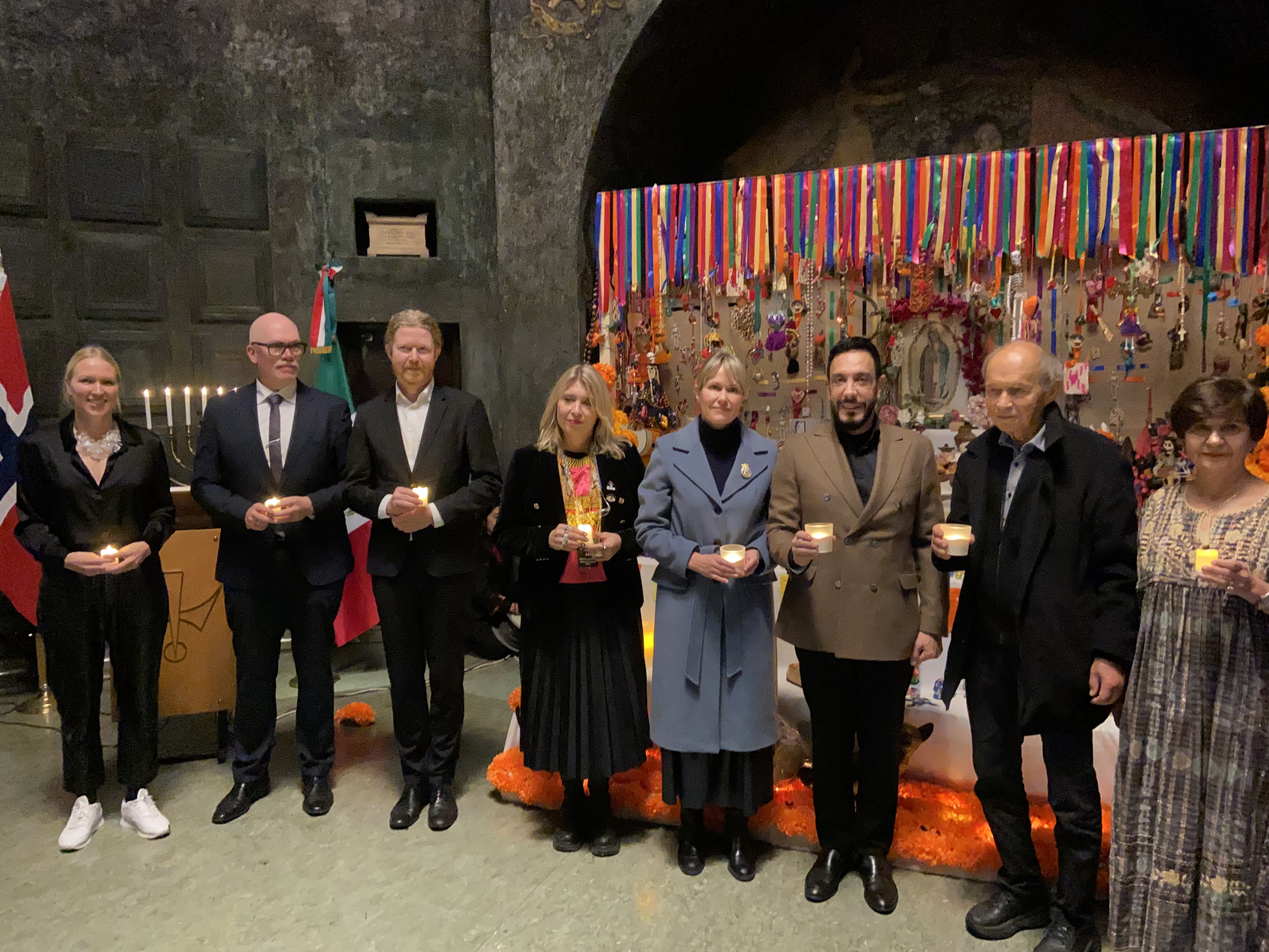 El pasado sábado 1º de noviembre, el Embajador Omar Fayad, junto con la Alcaldesa de Oslo Anne Lindboe, inauguró el altar de Día de Muertos de la Embajada de México en Noruega, en Vestre Gravlund, el cementerio principal de esta capital. La ofrenda está dedicada a Emanuel Vigeland, uno de los artistas noruegos más icónicos y cuyo 150º aniversario de nacimiento se celebra este año, así como a las decenas de personas que perdieron la vida en las últimas semanas debido a los desastres naturales en México. La instalación se encuentra en la Gamle Kapell, que fue pintada por el mismo artista, y que únicamente se abrió para hospedar el altar.