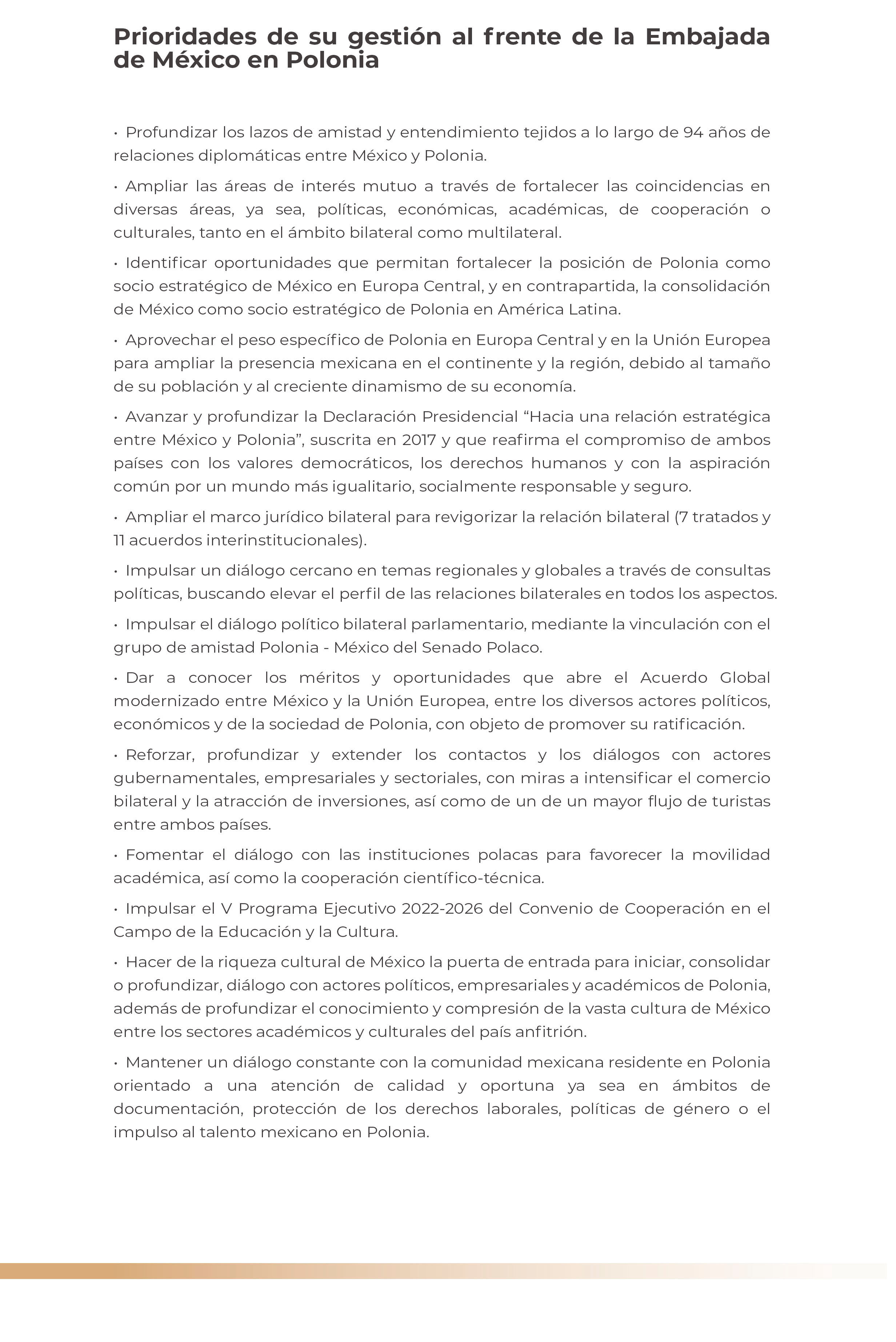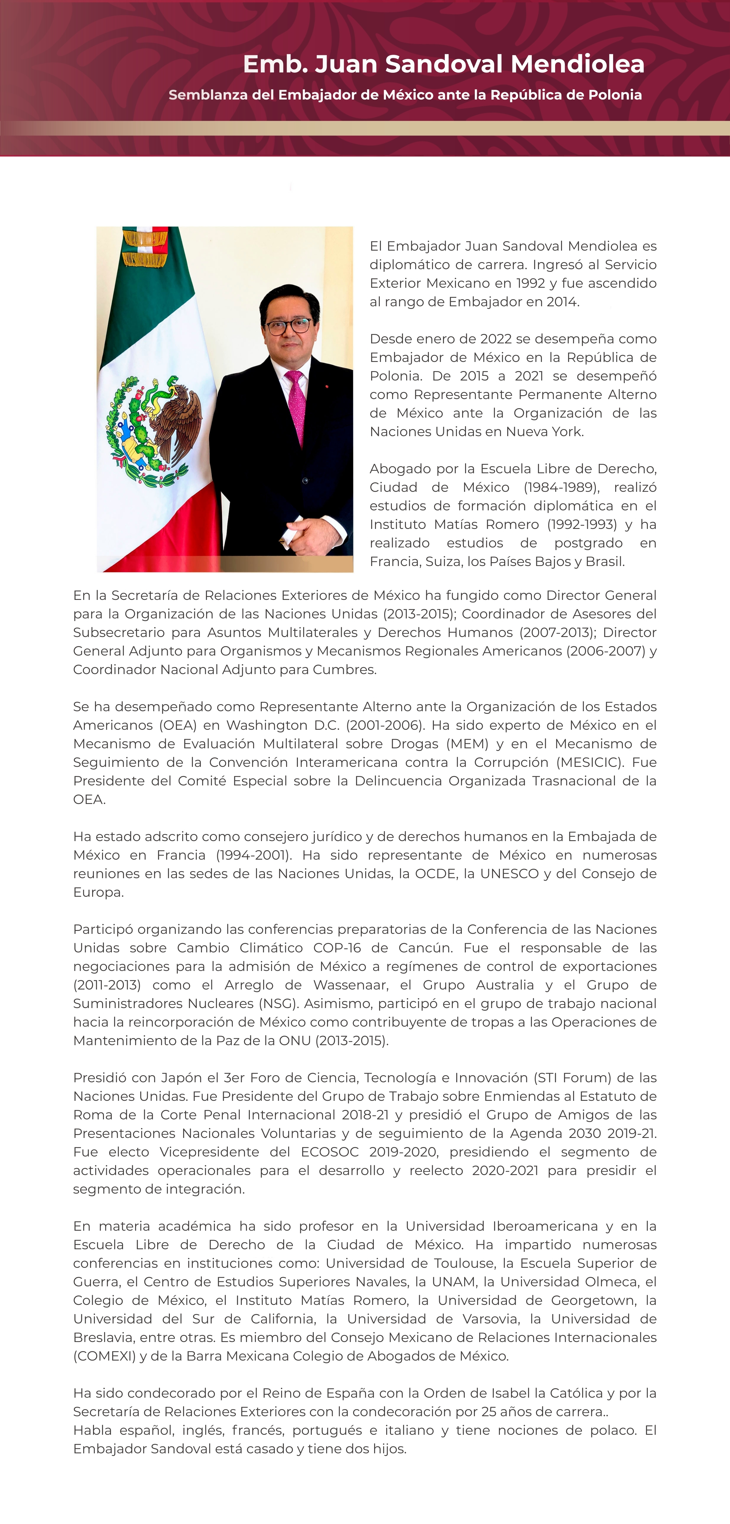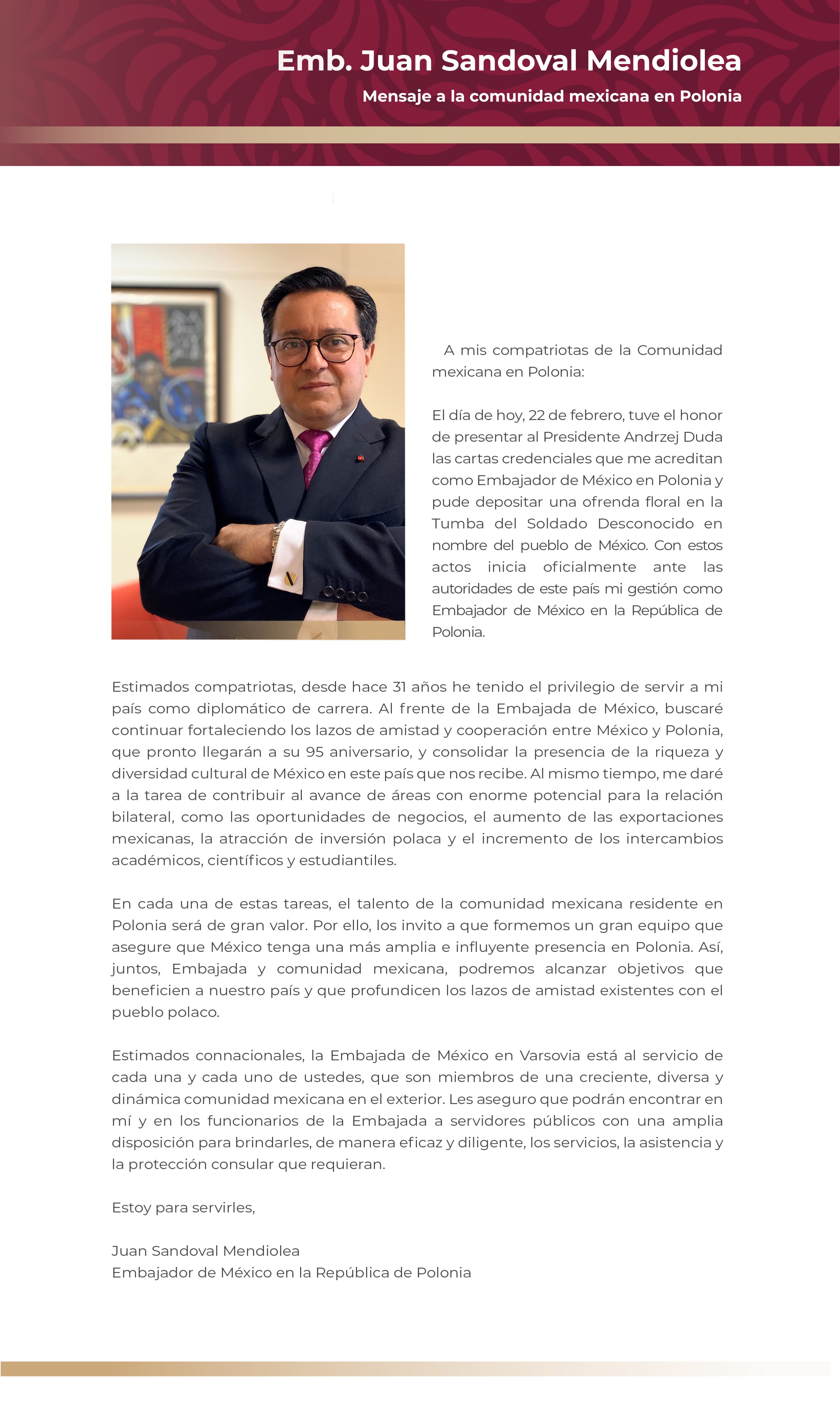 Semblanza del Embajador de México ante la República de Polonia y Prioridades de su gestión Mensaje a la Comunidad Mexicana