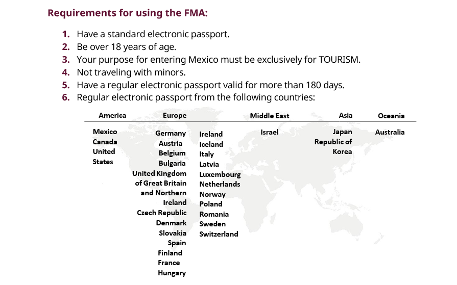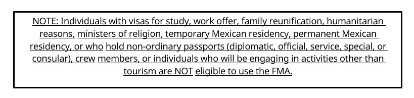 - Purpose for entering Mexico must be tourism. (Individuals with visas for study, work, family reunification, humanitarian reasons, ministers of religion, temporary Mexican residency, permanent Mexican residency, or who hold non-ordinary passports (diplomatic, official, service, special, or consular), crew members, or individuals who will be engaging in activities other than tourism are NOT eligible to use the FMA).