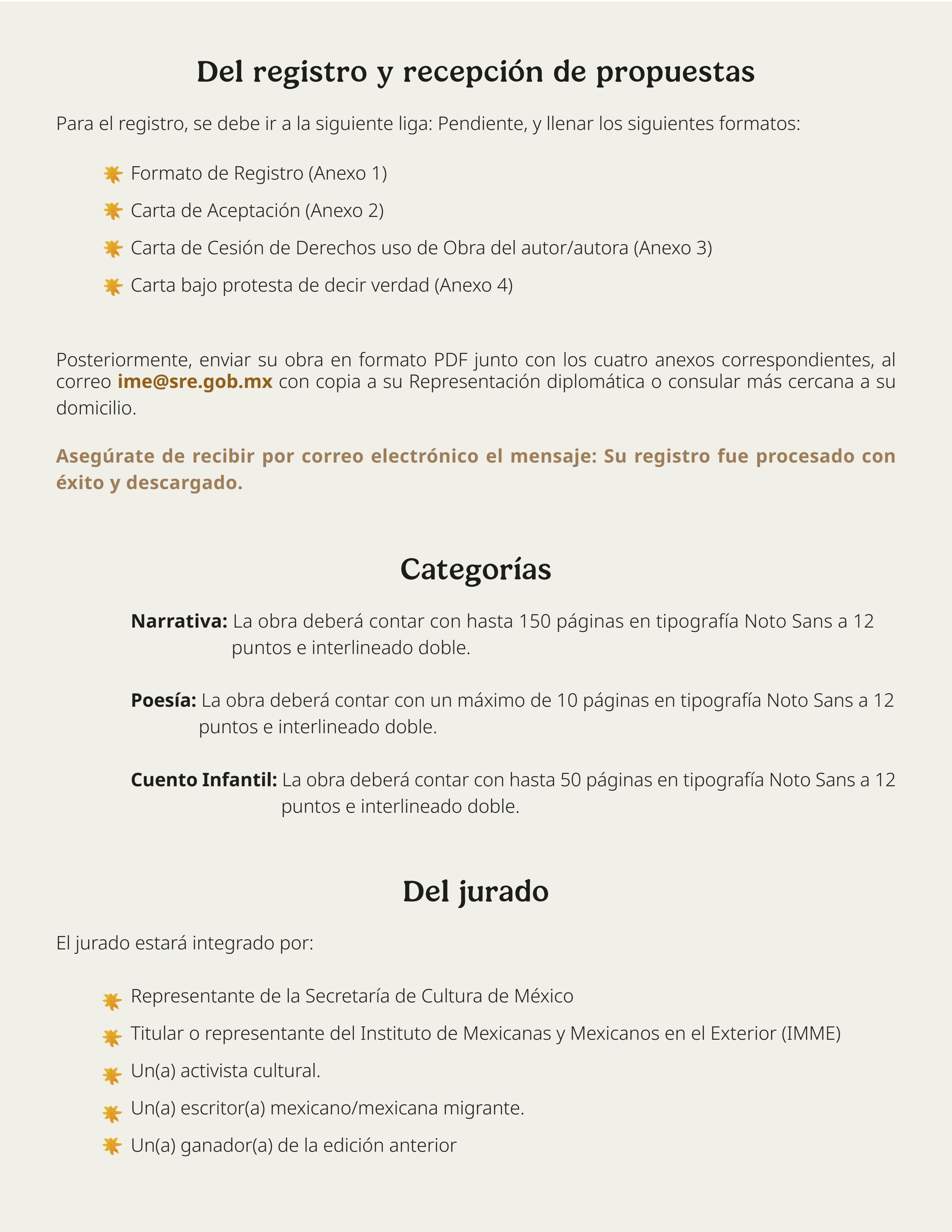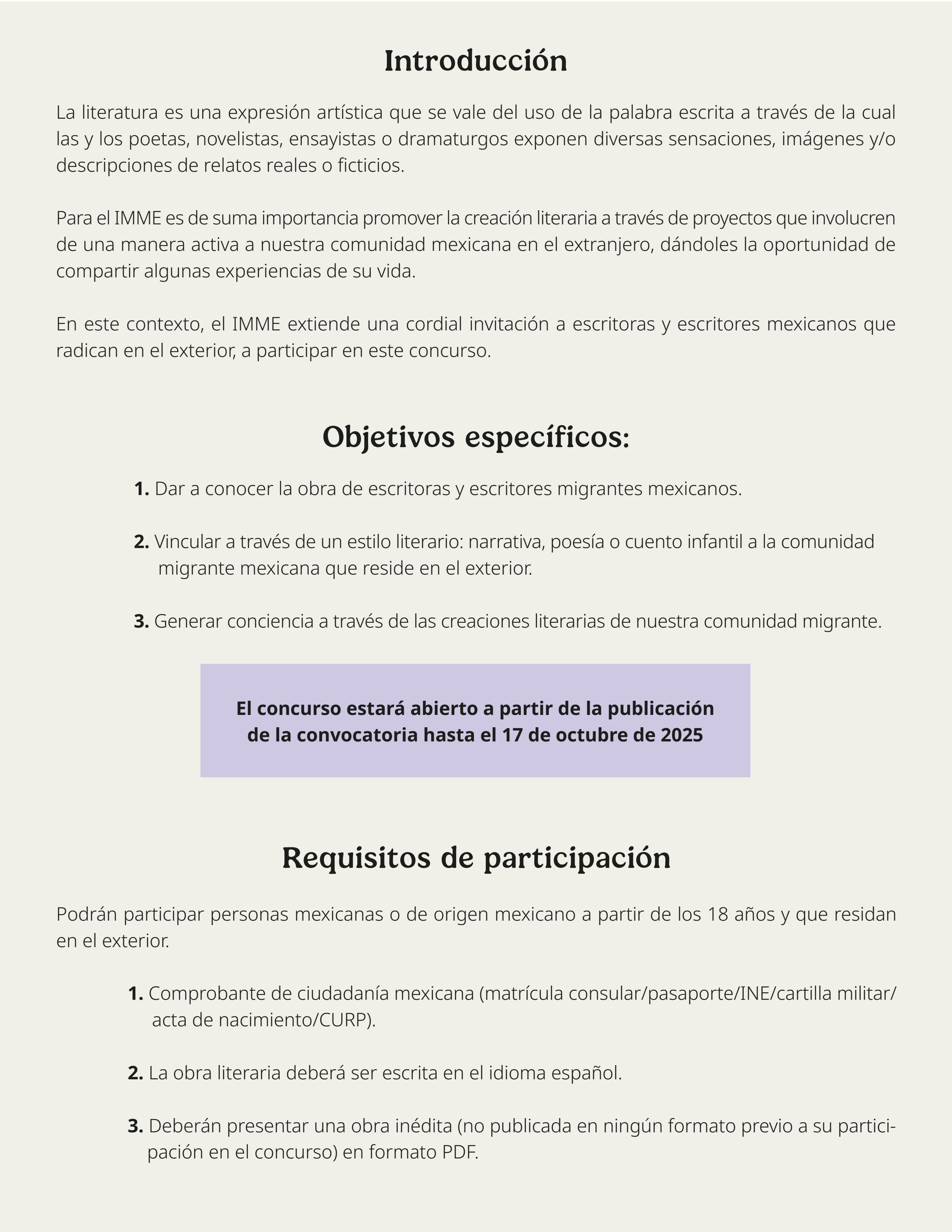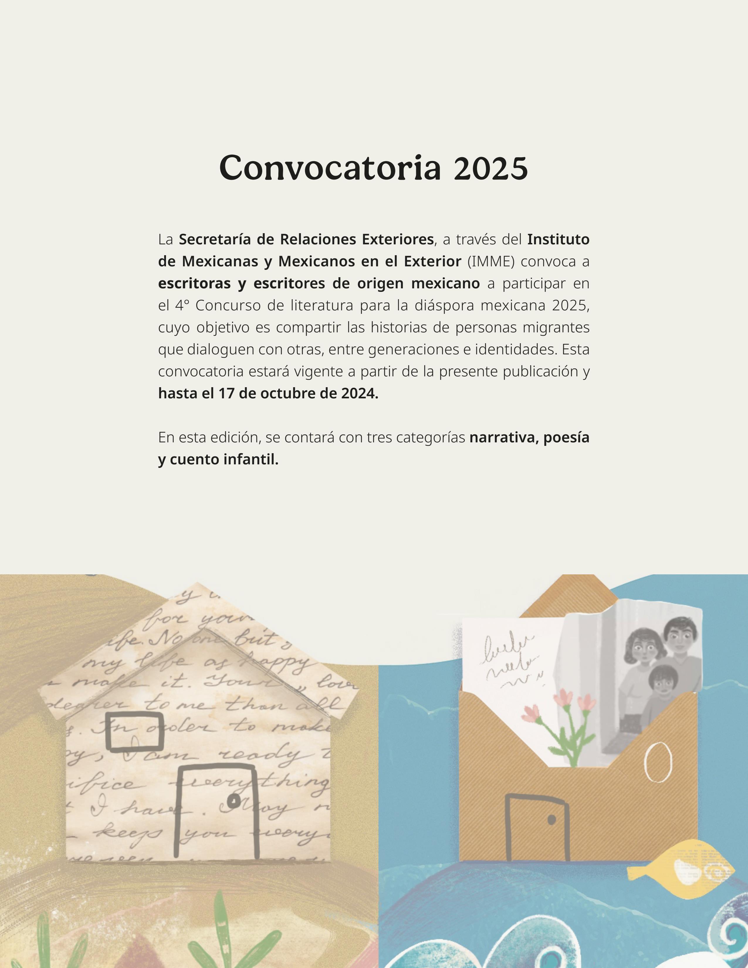 La Convocatoria del 4° Concurso de Literatura para la Diáspora Mexicana, la cual permanecerá abierta hasta el próximo 17 de octubre de 2025.
