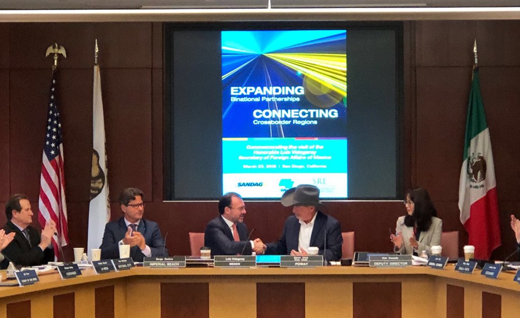Previamente, el Secretario Videgaray participó en una sesión de la Mesa Directiva de la Asociación de Gobiernos de San Diego (SANDAG), que aglutina a autoridades regionales para la toma de decisiones en la zona Cali-Baja (integrada por los estados de California, en Estados Unidos, y Baja California, en México), con lo que se convirtió en el primer Canciller mexicano en acudir a este foro.